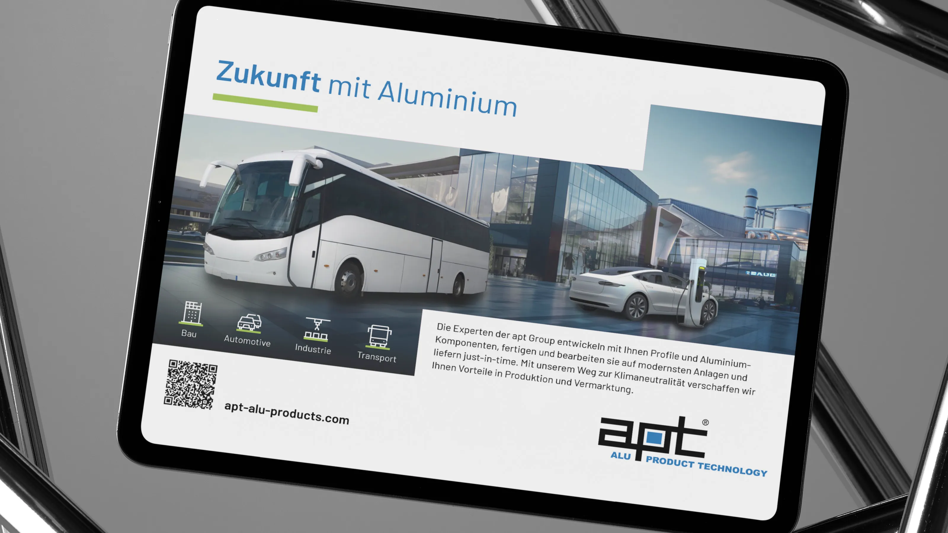 Ziel der Zusammenarbeit war es, den Marken- und Unternehmensauftritt grundlegend zu modernisieren, die Kommunikation neu aufzusetzen und die Sichtbarkeit von apt national wie international deutlich zu erhöhen. Gleichzeitig sollte apt klar und verständlich als starker Partner für individuelle Aluminiumlösungen positioniert werden.