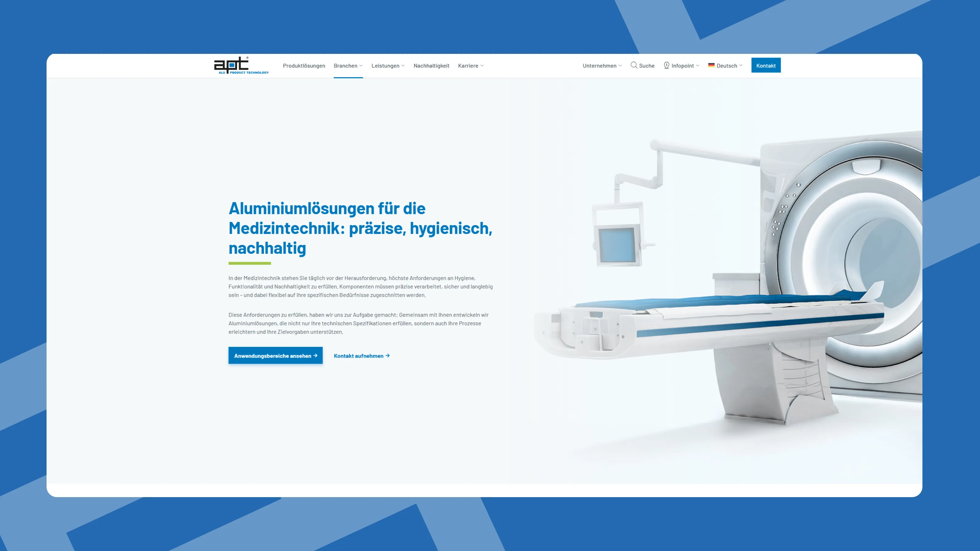 Vor dem Start der Zusammenarbeit war der Auftritt von apt nicht mehr zeitgemäß. Sowohl die Marketingunterlagen als auch die digitale Präsenz konnten die Leistungsfähigkeit, die Erfahrung und die internationale Ausrichtung des Unternehmens nur eingeschränkt wiedergeben.