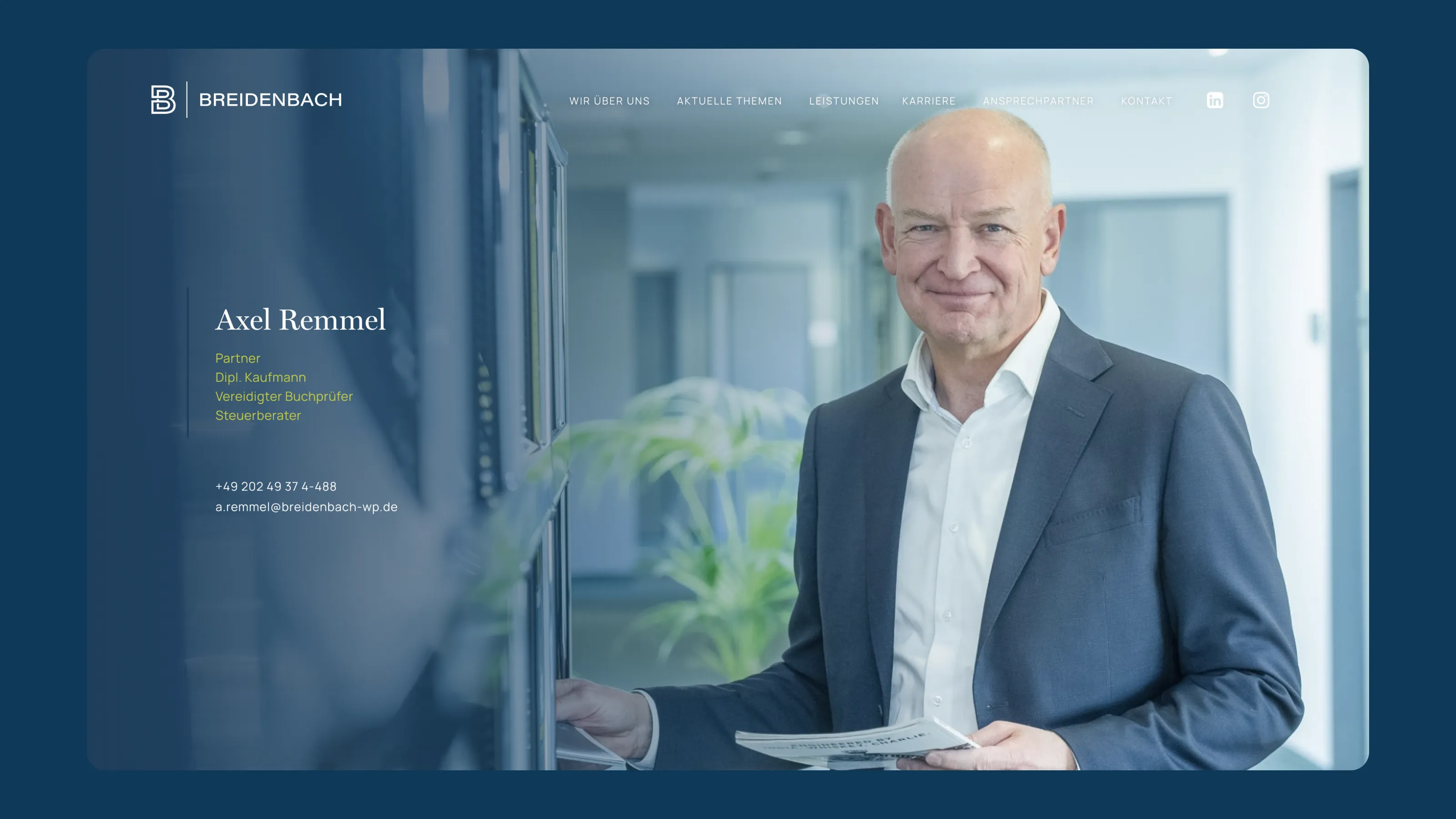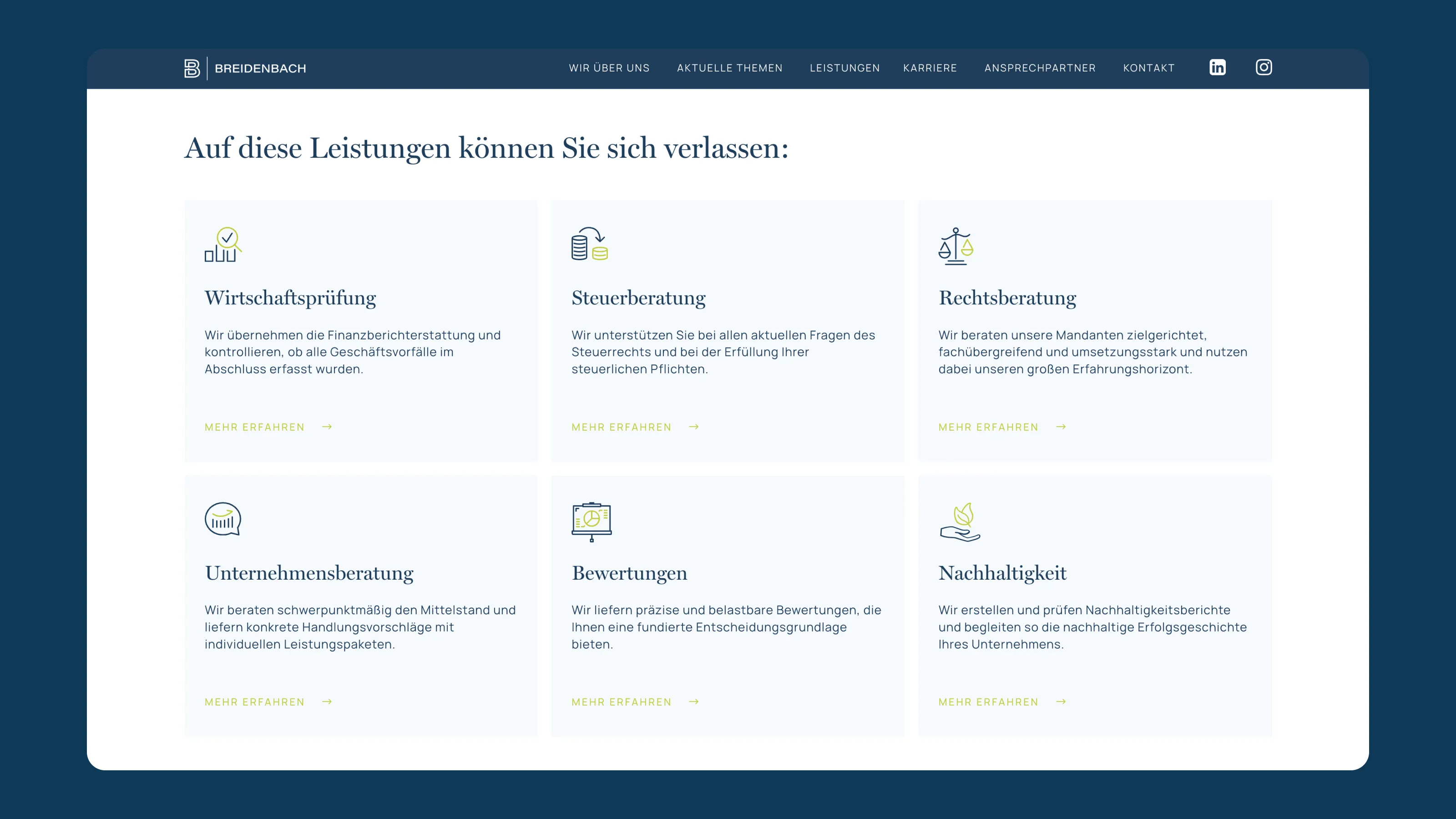 Ziel war es daher, eine moderne Website zu schaffen, die Breidenbach als ganzheitlich aufgestellte Wirtschaftskanzlei sichtbar macht und zugleich die persönliche, familiäre Atmosphäre erlebbar werden lässt. Neben der klaren Darstellung von Kompetenz und Leistung sollte der neue Auftritt auch die Werte der Kanzlei widerspiegeln und zeigen, was Breidenbach als Arbeitgeber auszeichnet – ohne den Fokus von der fachlichen Exzellenz zu nehmen.